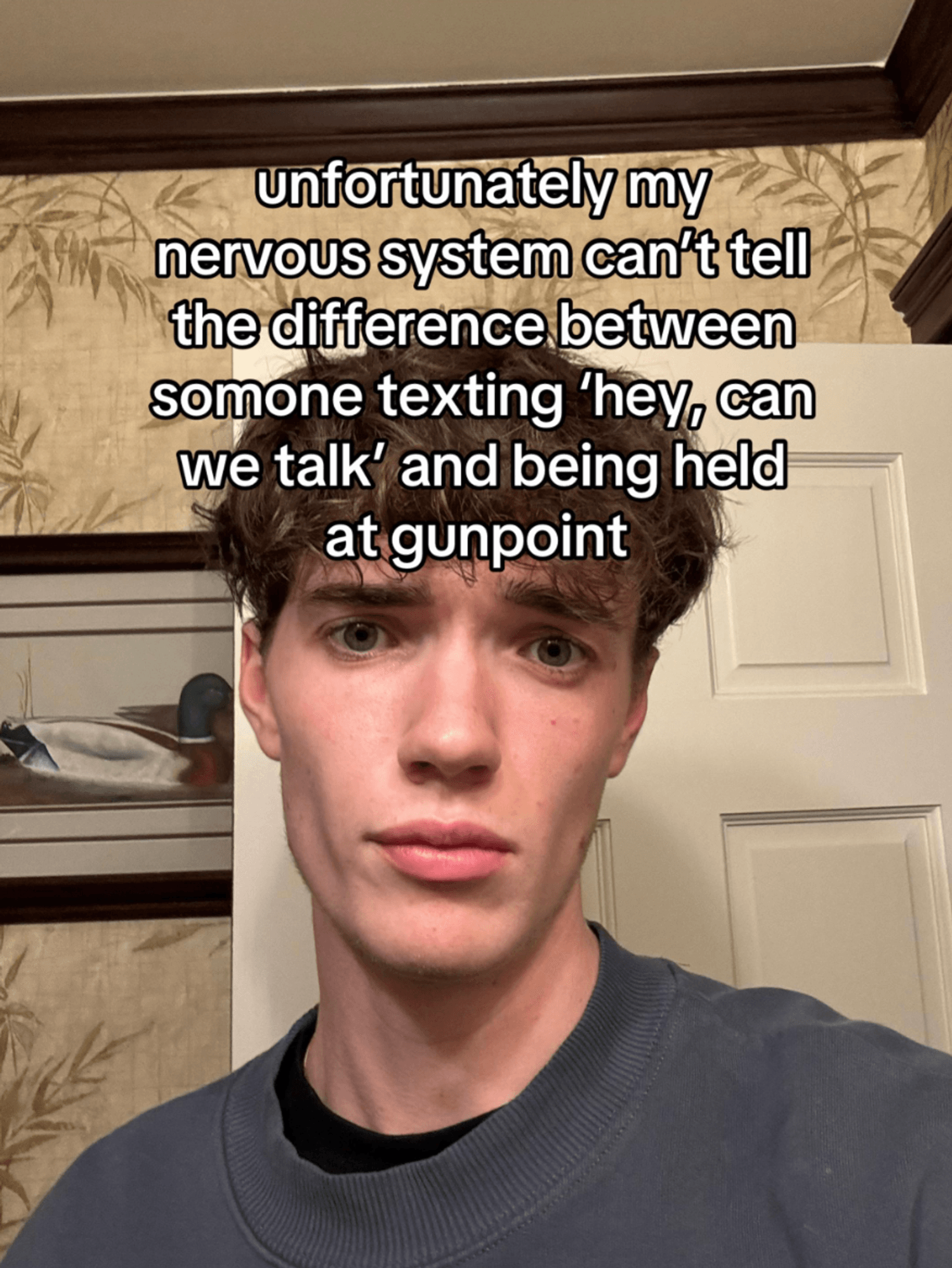 One example is from TikToker @benmmichael who posted: “Unfortunately my nervous system can’t tell the difference between someone texting ‘Hey can we talk’ and being held at gunpoint”, to the tune of P!nk’s 2012 song Try.